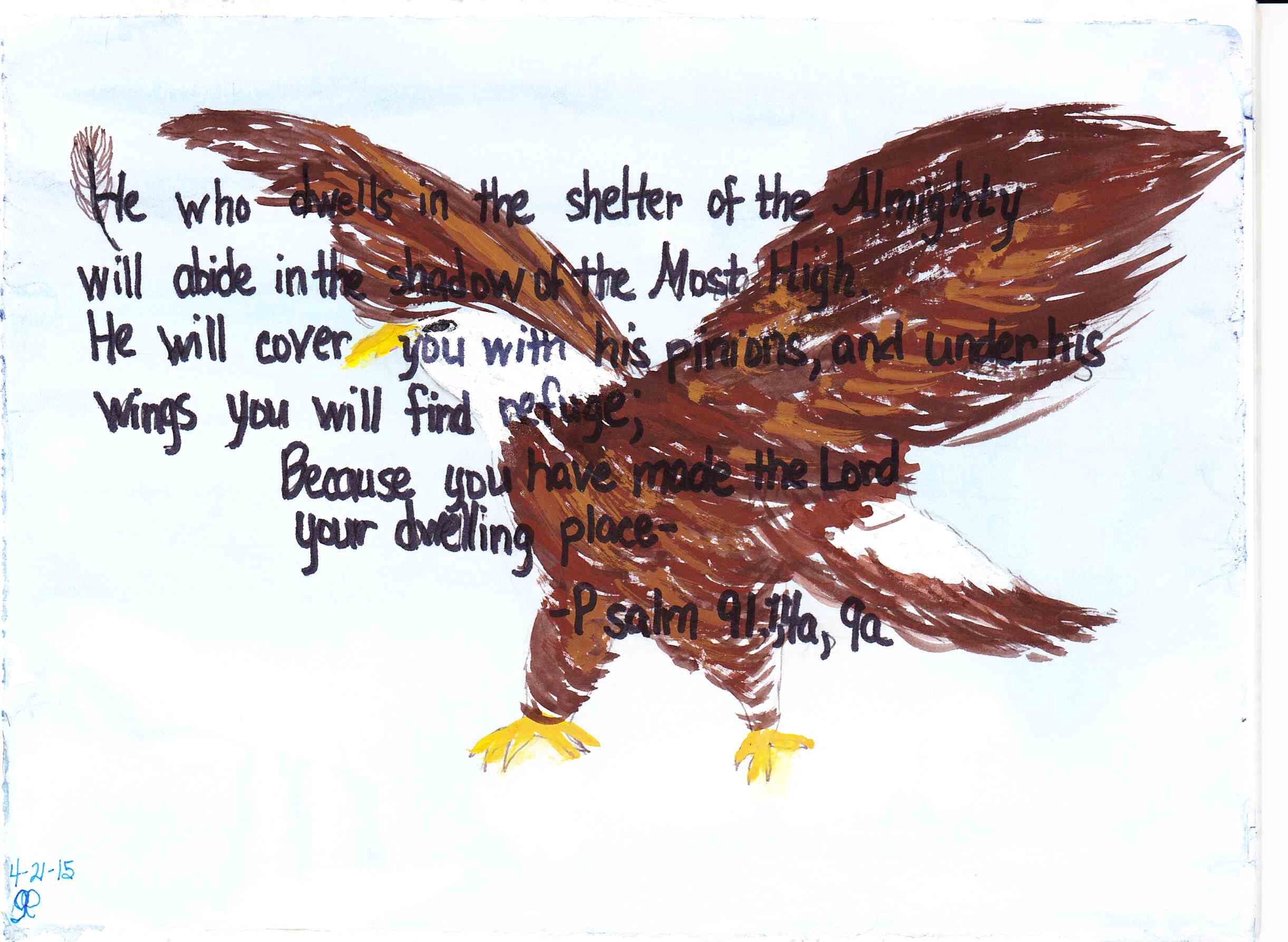 In the book study on Spiritual Whitespace, author Bonnie Gray encouraged followers to pick a favorite verse write it on the page and illustrate it with watercolor. To be daring I tried this. I was inspired by the image of an eagle protecting it’s young. There was a now famous pair of eagles in Pennsylvania who valiantly protected their young through the winter snows.
